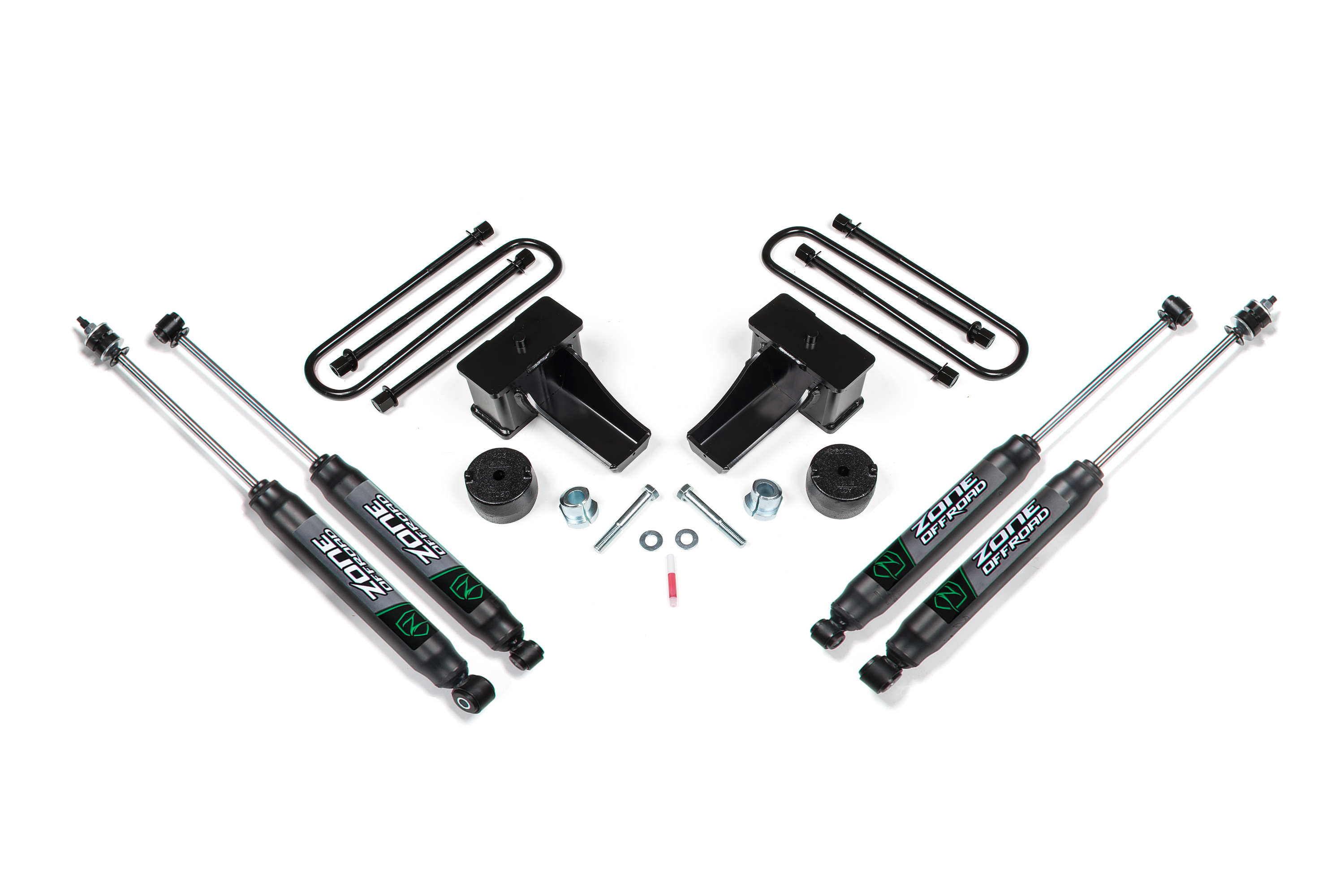 - High strength, black e-coated u-bolts to secure the new rear lift blocks.