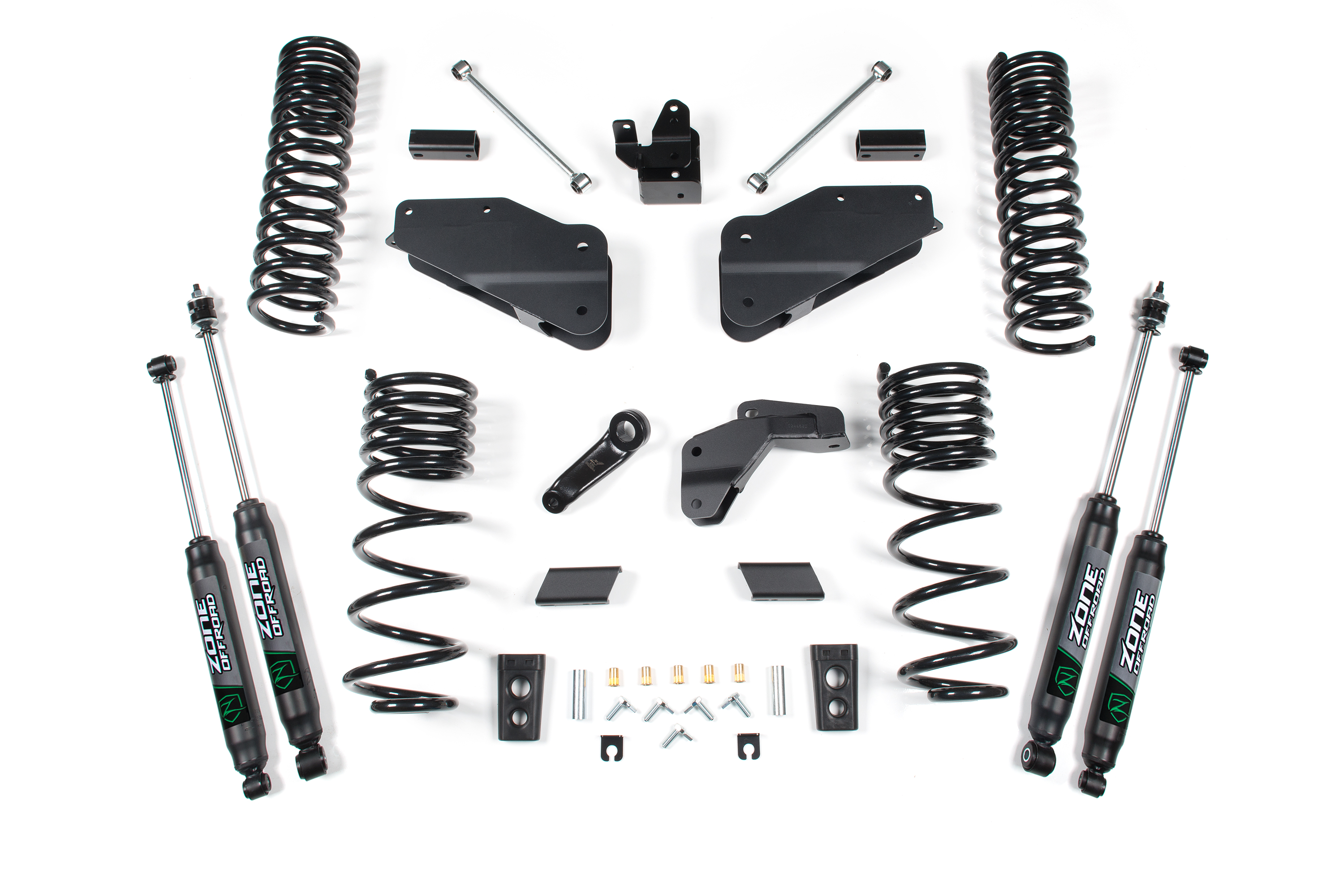 Take your RAM 2500 to new heights with this 5.5 Inch lift kit from Zone Offroad. Kits include everything needed from front/rear coil springs and stout radius arm relocation brackets to steering correction and rear lift to level the stance.