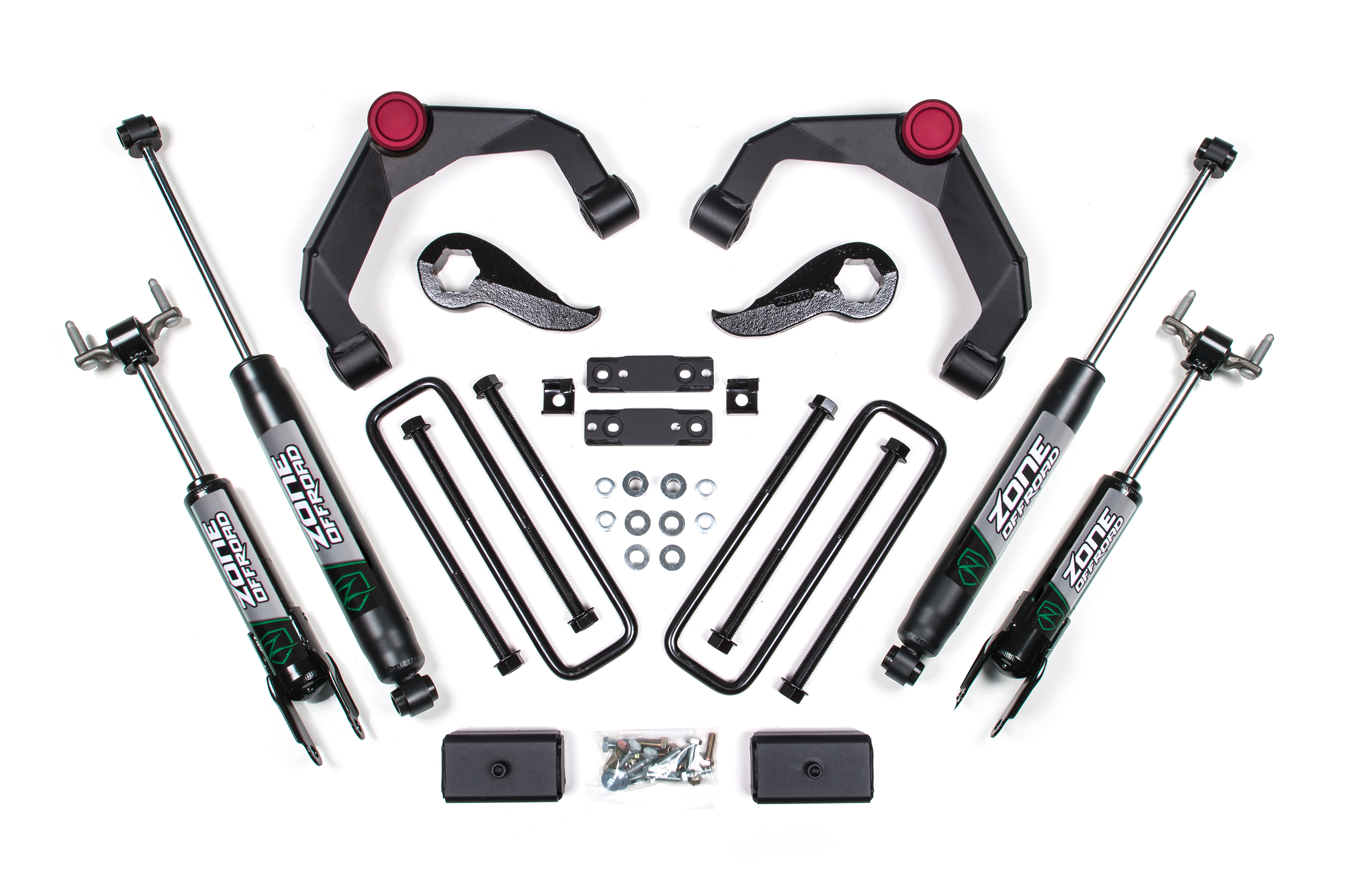 They use OE durometer rubber bushings and greaseable OE-style heavy duty ball joints for quiet, reliable operation and superior corrosion resistance to uniball style control arms. Along with the arms, a pair of reindexed cast steel torsion bar keys are supplied up front to lift vehicle. Zone Offroad includes a small differential relocation kit (4WD models only) to correct CV axle operating angles without effecting ground clearance.