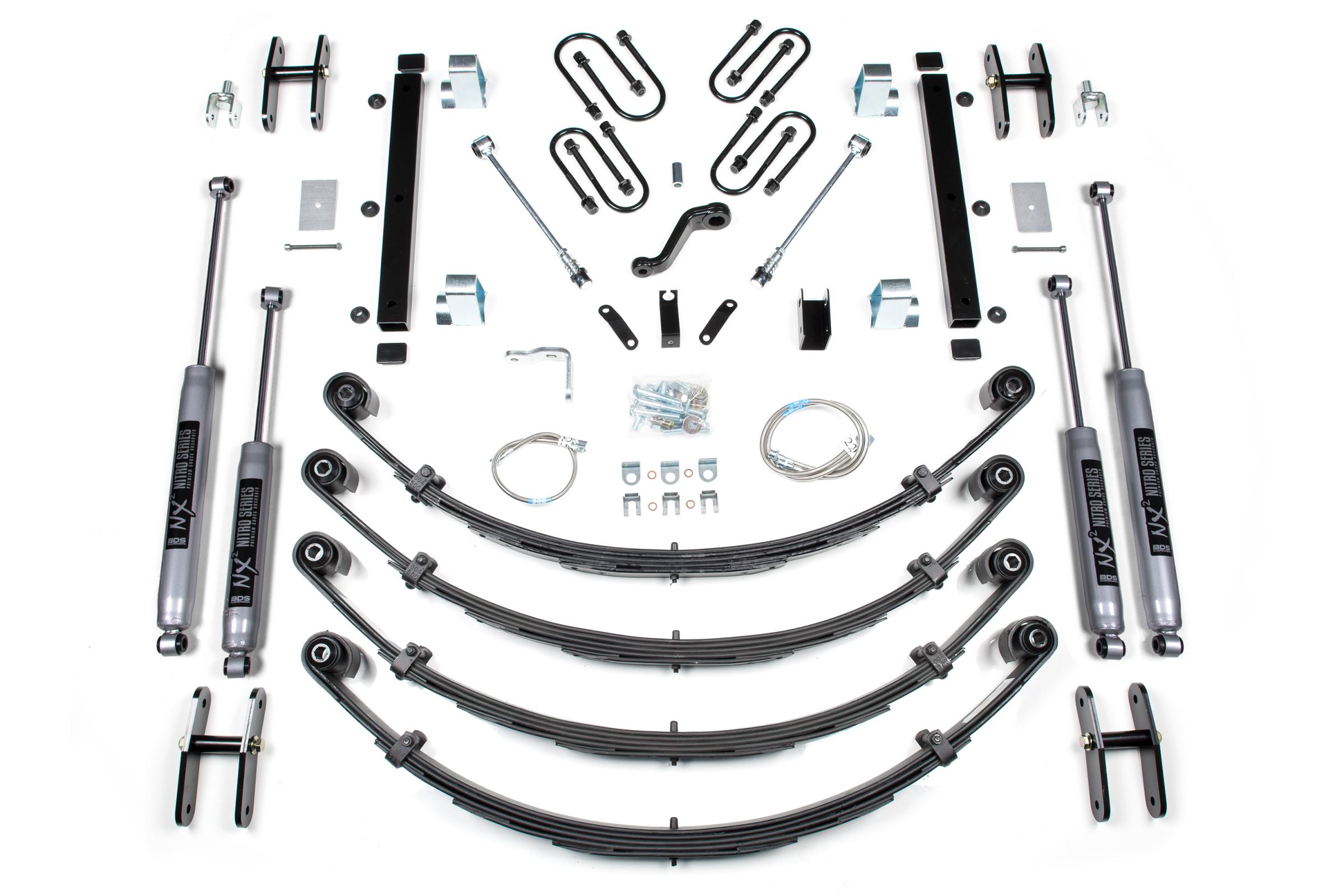 This 6-inch lift kit includes front and rear Glide-Ride leaf springs with new u-bolts, front and rear track bar relocation brackets to center the axle, stainless steel braided brake lines, sway bar disconnects, power steering pitman arm, bump stop extensions, a transfer case drop kit to ease the drive line angles and 1 inchextended shackles to let your springs really flex. Round out this kit with specially tuned NX2 nitro series gas shocks to offer improved damper performance.