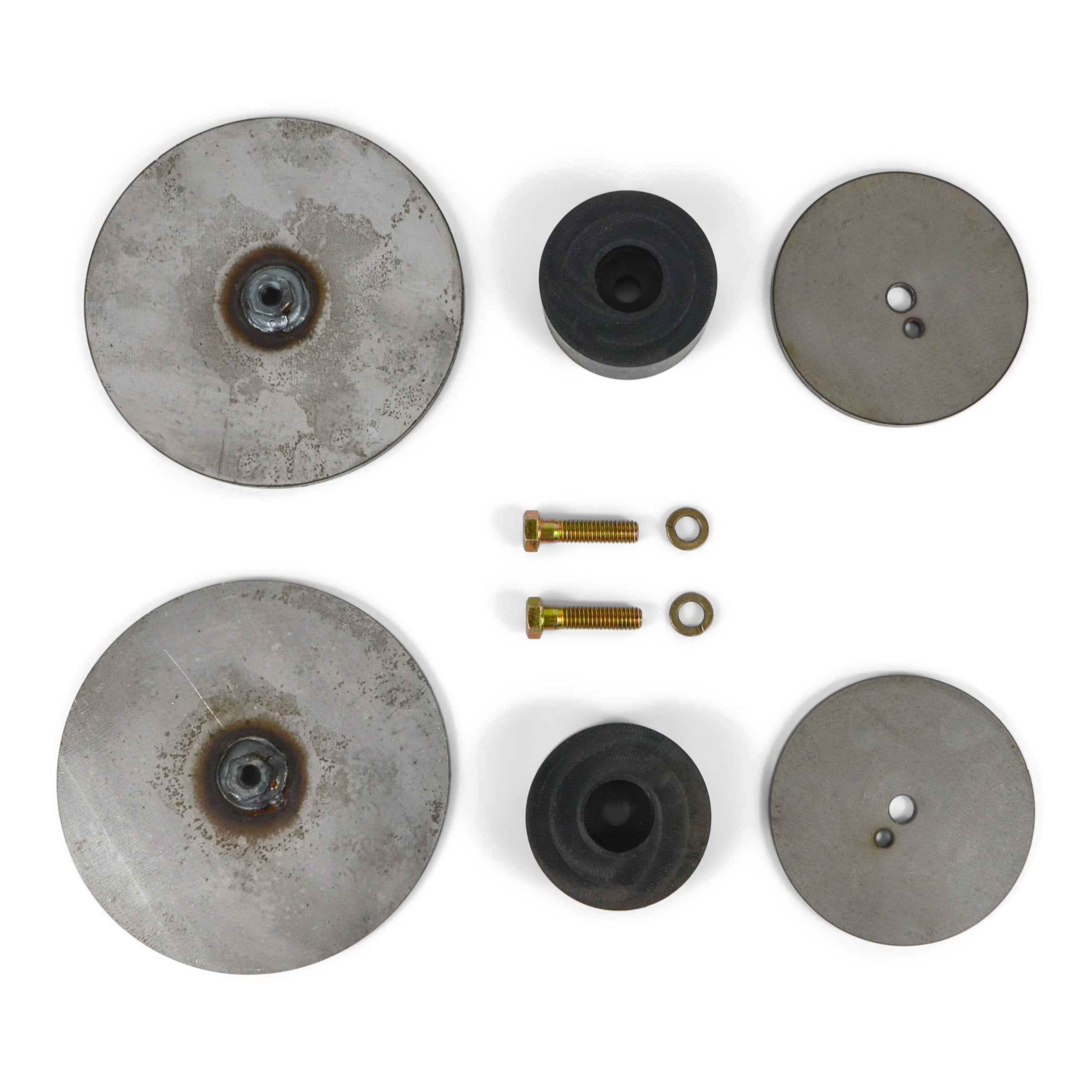 Kit consists of a 6 Inch 3/16s laser cut plate, weld nut, poly spacer and 4 Inch 3/16 Inch top plate.