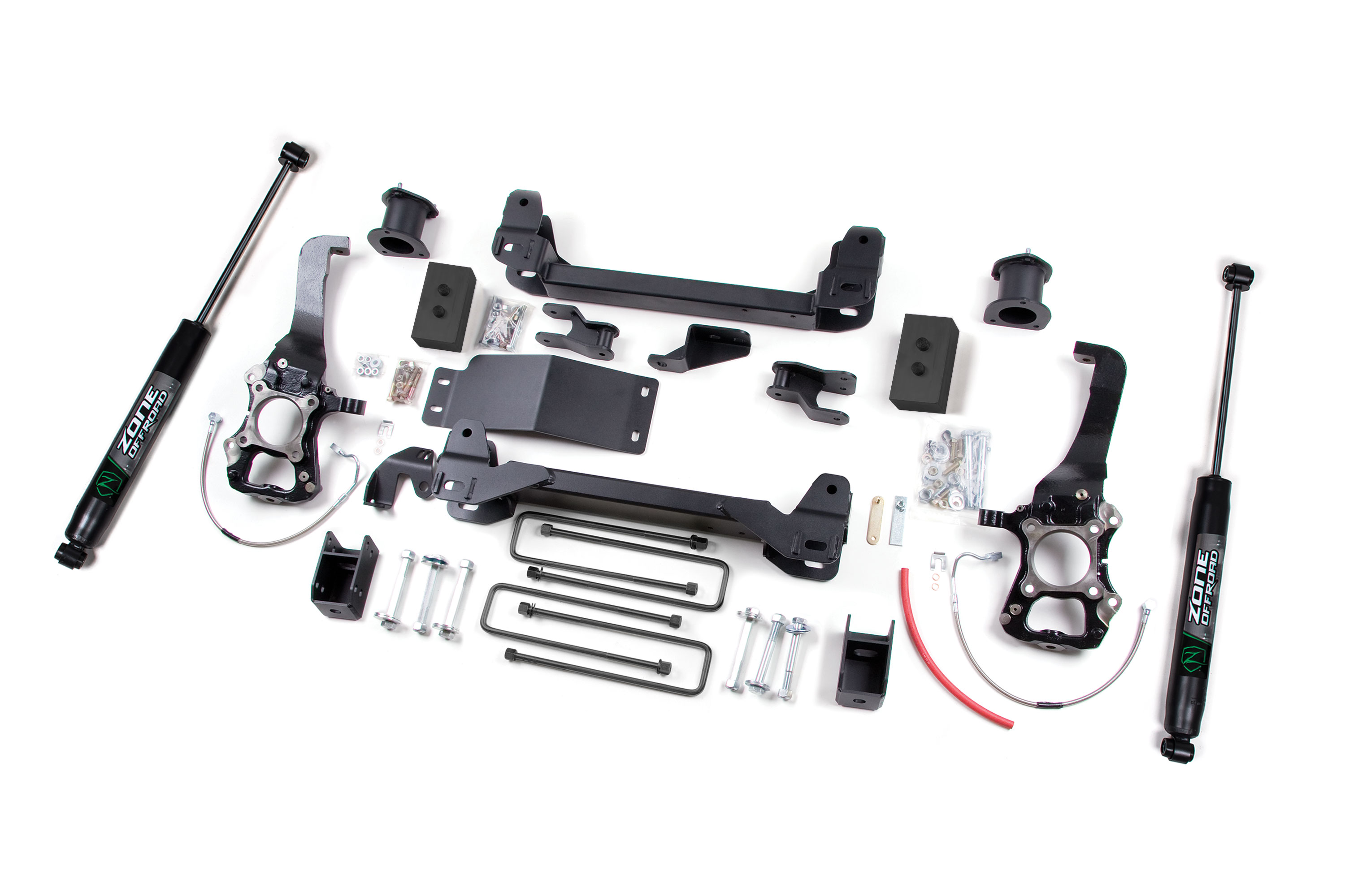 Take your F150 to new heights with this 4 Inch lift kit from Zone Offroad. Kits include everything needed from high strength crossmembers and steering knuckles to strut spacers and and rear block kit to level out the stance.