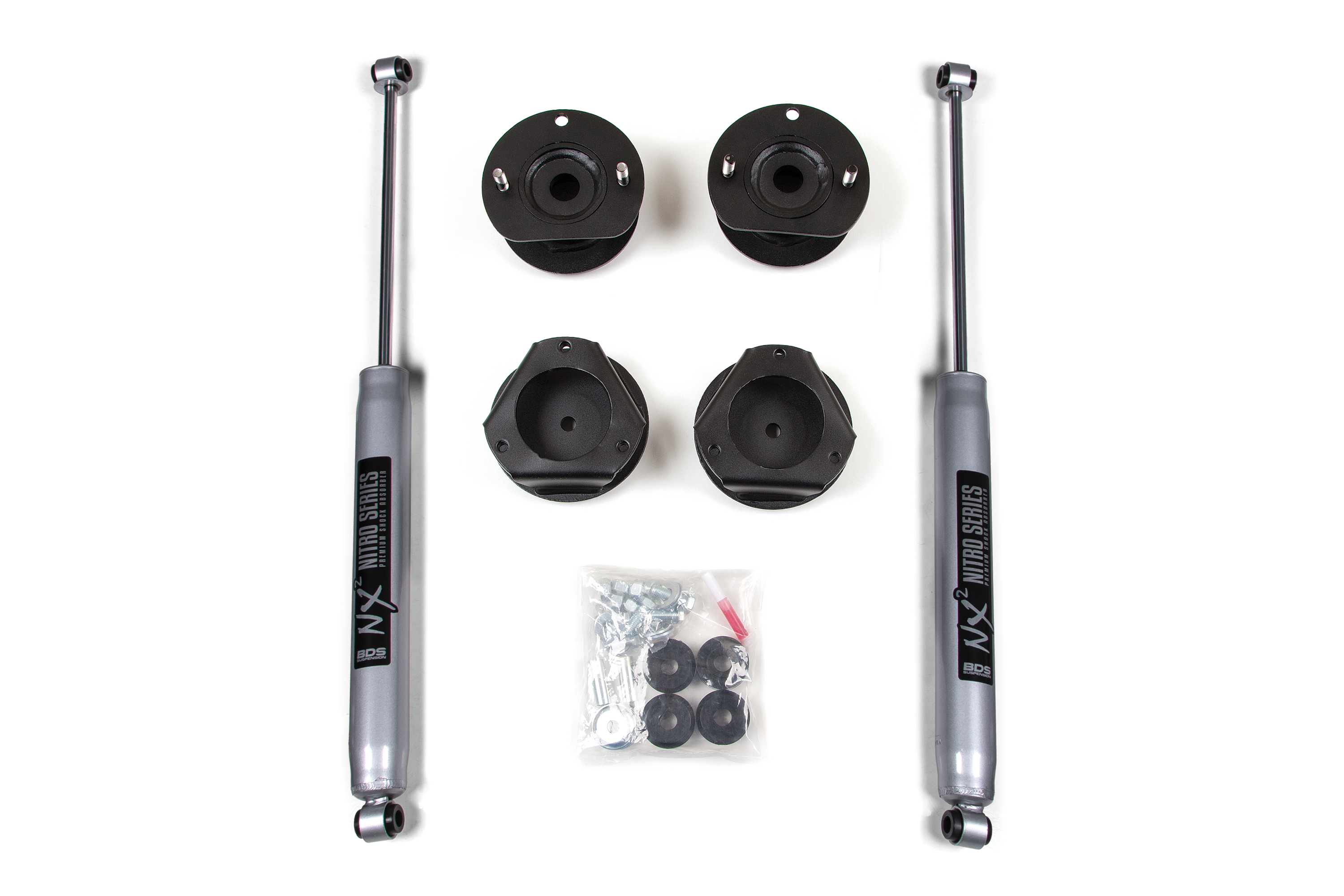 The lift kit Includes steel top mount strut spacers, rear coil spring mounts and custom-tuned NX2 Nitro or FOX Performance series shocks.