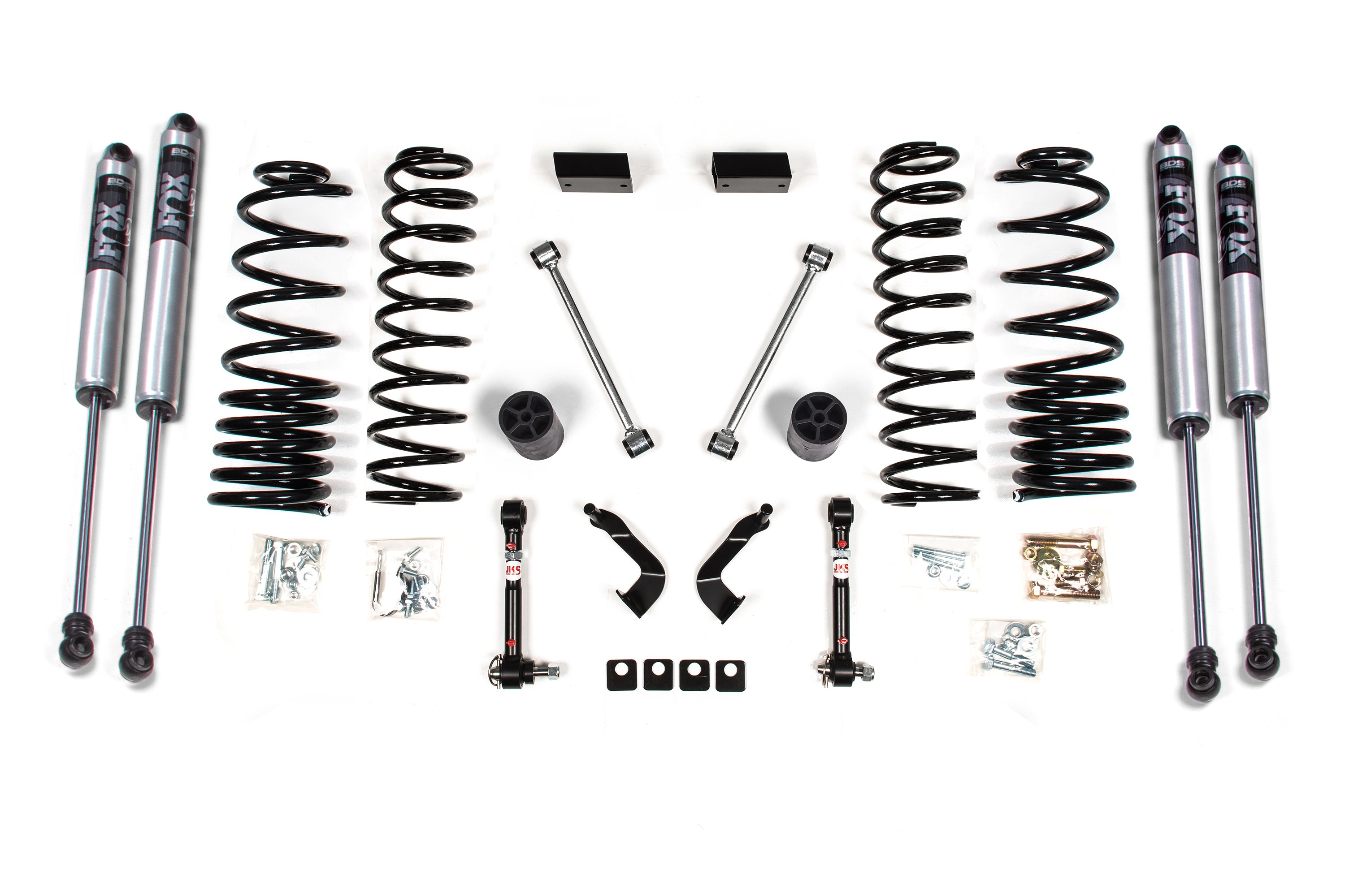 The lift kit includes front and rear BDS Pro-Ride Coil Springs, bump stop extensions, front lower control arm cam locks, JKS quicker disconnects to unlock the front suspension's potential to flex while maintaining quiet on road operation, rear sway bar links, and your choice of specially tuned NX2 nitro series gas shocks or FOX 2.0 Internal Floating Piston performance series gas shocks to offer improved damper performance.
