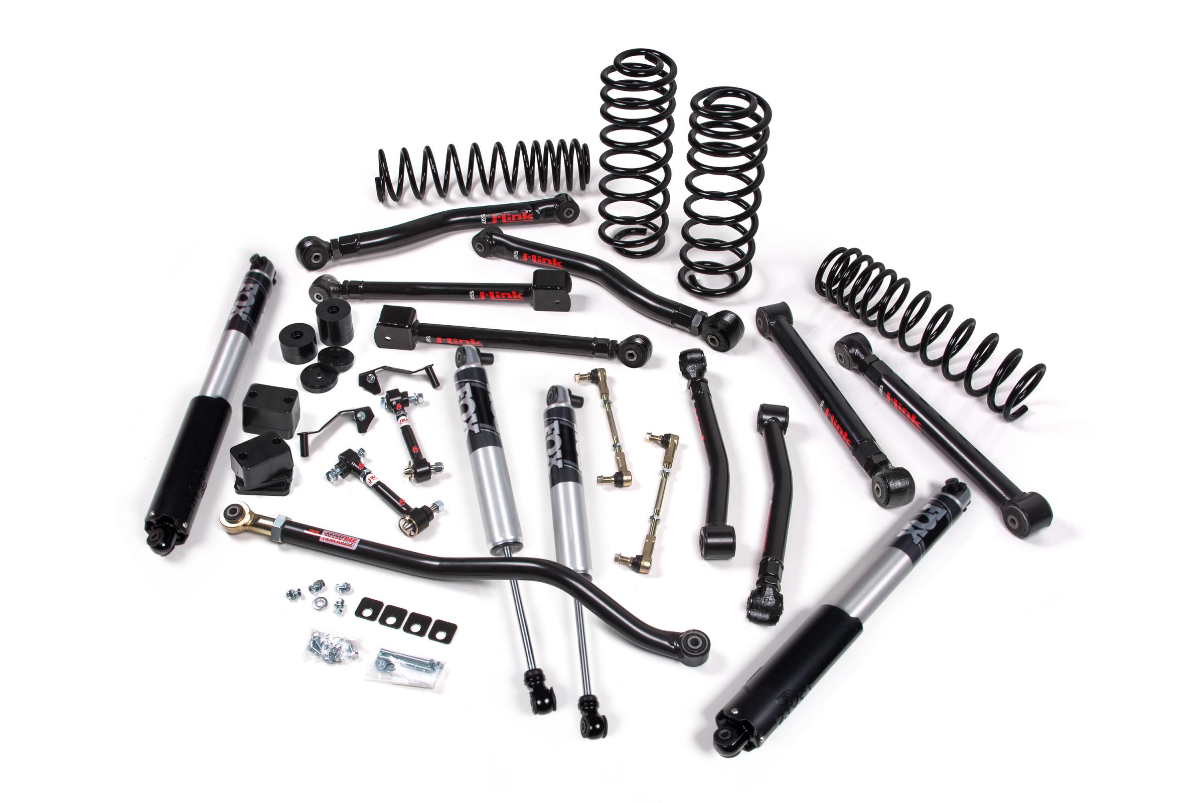 Includes one FOX88624155, Kit: 2018-2024 Jeep Wrangler JL, Front and Rear, 2-3.5 inch Lift, 2.5, IFP, UPC Code 814897017788 Includes one JKS1632, 2018-2024 Jeep Wrangler JL Front Adjustable Lower Control Arm Kit, UPC Code 711745607125 Includes one JKS1634, 2018-2024 Jeep Wrangler JL / 2020-2024 Jeep Gladiator JT Adjustable Front Upper Control Arm - Rubber, UPC Code 711745607163 Includes one JKS1636, 2007-2018 Jeep Wrangler JK, 2018-2024 Jeep Wrangler JL Rear Adjustable Adjustable Lower Control Arm - Rubber, UPC Code 711745607101 Includes one JKS1639, 2007-2018 Jeep Wrangler JK 2018-2024 Jeep Wrangler JL Rear Adjustable Upper Control Arm - Rubber, UPC Code 711745607088 Includes one JSPEC1252, 2018-2024 Jeep Wrangler JL 2.5 inch Front Coil Spr inchg Kit - HD, UPC Code 814897012295 Includes one JSPEC1258, 2018-2024 Jeep Wrangler JL 2.5 inch Rear Coil Spr inchg Kit - HD, UPC Code 814897012301 Includes one JSPEC1312, 2018-2024 Jeep Wrangler (JL) J-Krawl Ma inch Box Kit, UPC Code 814897012592