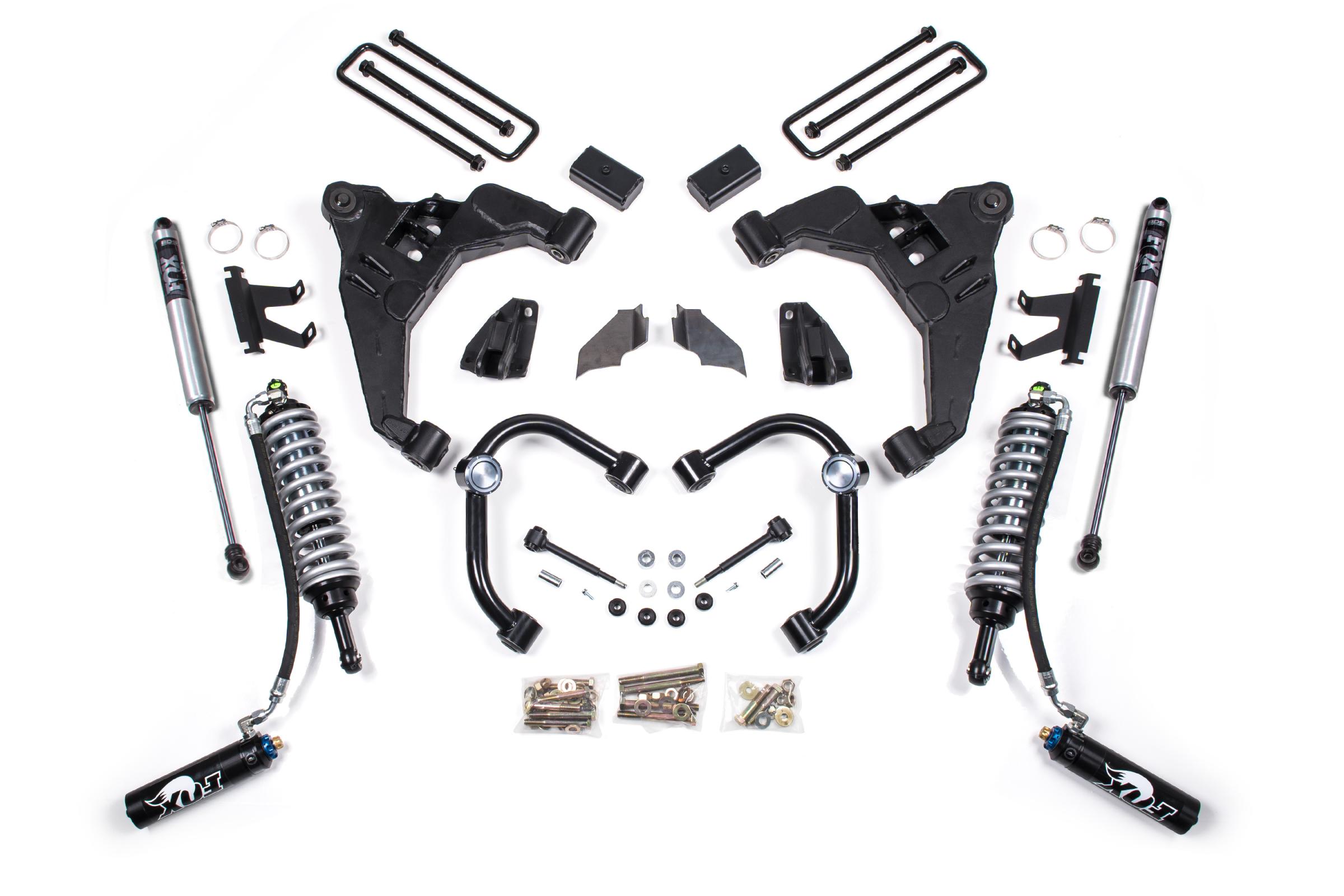 These kits feature proprietary FOX 2.5 coil-over shocks designed specifically to bolt-on performance for increased travel and the ability to soak up the roughest terrain along with smooth on-road comfort.