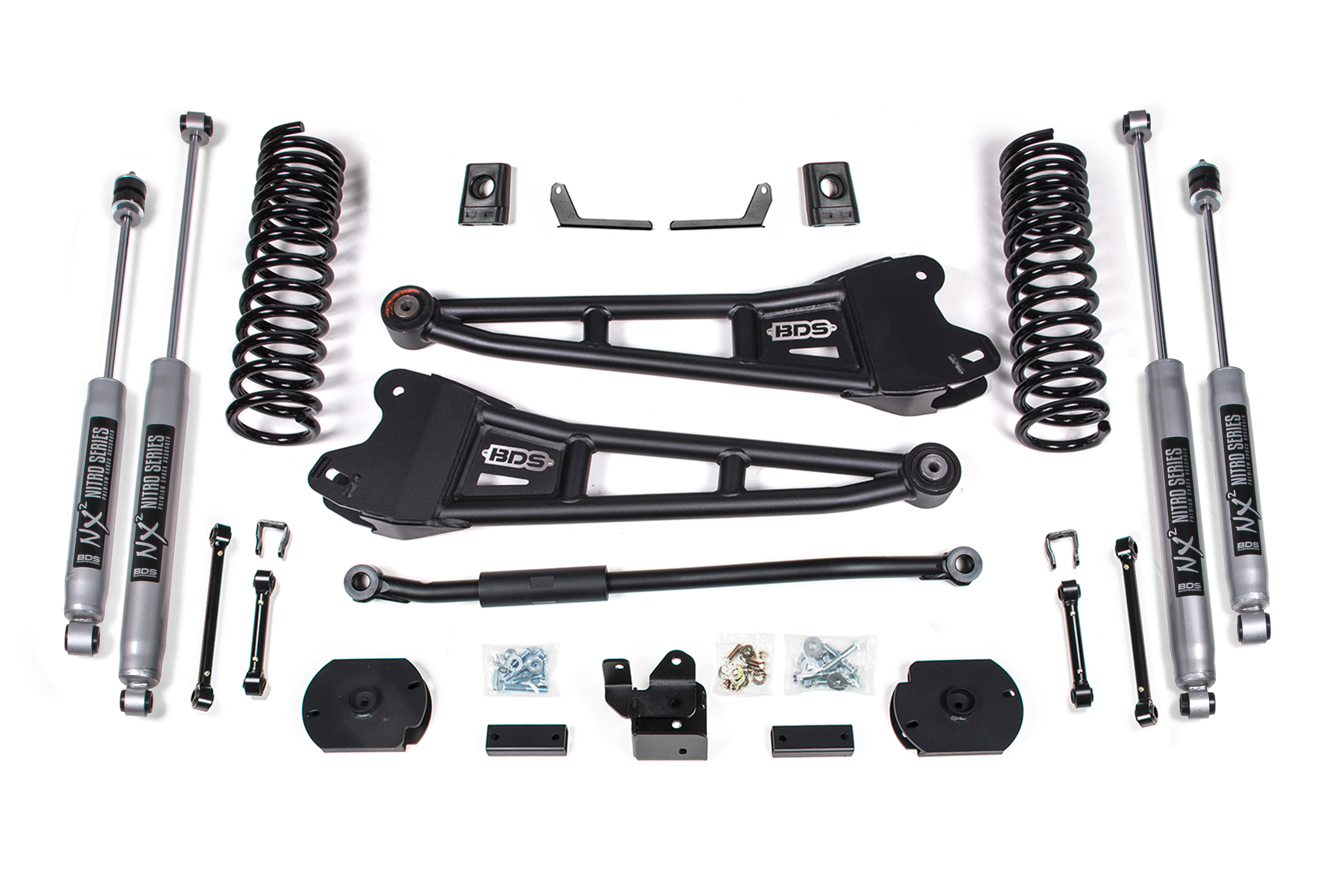 Level out and take your 2014-2018 RAM 2500 diesel powered truck with this 3-inch radius arm lift kit from BDS Suspension. Works with factory air ride equipped trucks only. Designed to improve stance, performance, and capability, this kit includes everything necessary to set your truck up right with clearance for up to 35 inch Tires.