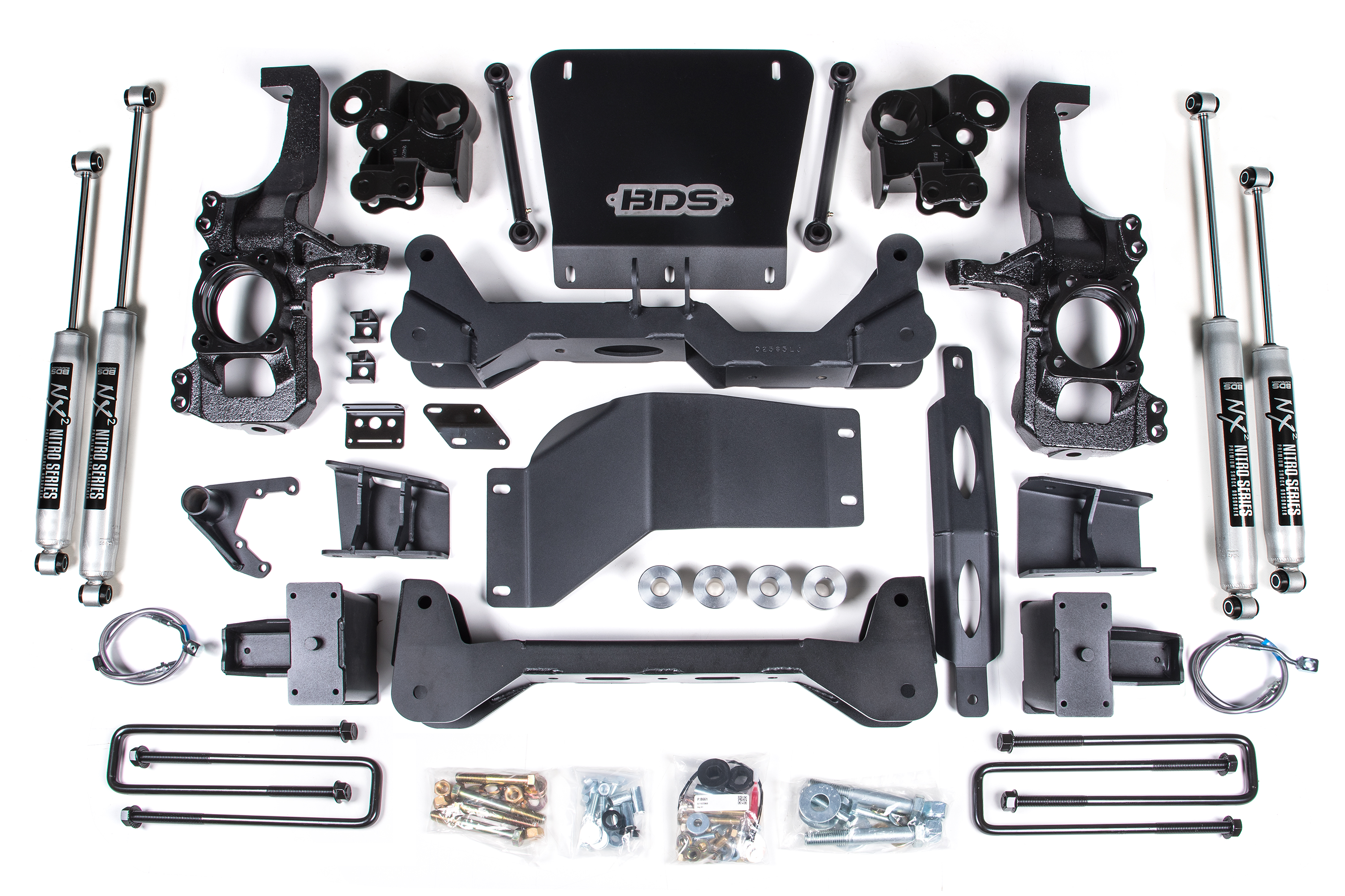 In the rear BDS offers replacement lift blocks and u-bolts to lift and level that stance. The lift block installs in place of the stock block and retains ride quality and load capacity. Also included, BDS supplies brake line and ABS line relocation brackets allow the use of factory brake lines. Lastly are a matching set of NX2 Nitro or FOX 2.0 Performance Series shocks.